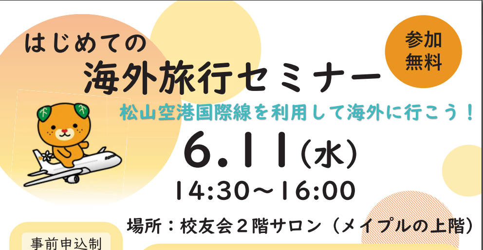 今回は愛媛県航空政策室・国際連携課と共催で、HIS担当者からも現地情報等ご案内があります。この機会に情報収集して、楽しい旅行のプランがたてられたらよいですね!(このセミナーは、事前申込制となります。)