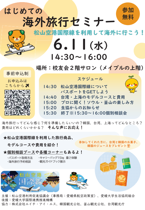 ―このセミナーでは、そんな疑問を持つ海外旅行初心者に、松山空港国際線についてやパスポートの取得のしかた、韓国・台湾・上海のモデルコースと費用、現地での楽しみ方などが紹介されます。詳しくは、下記チラシをご覧下さい。