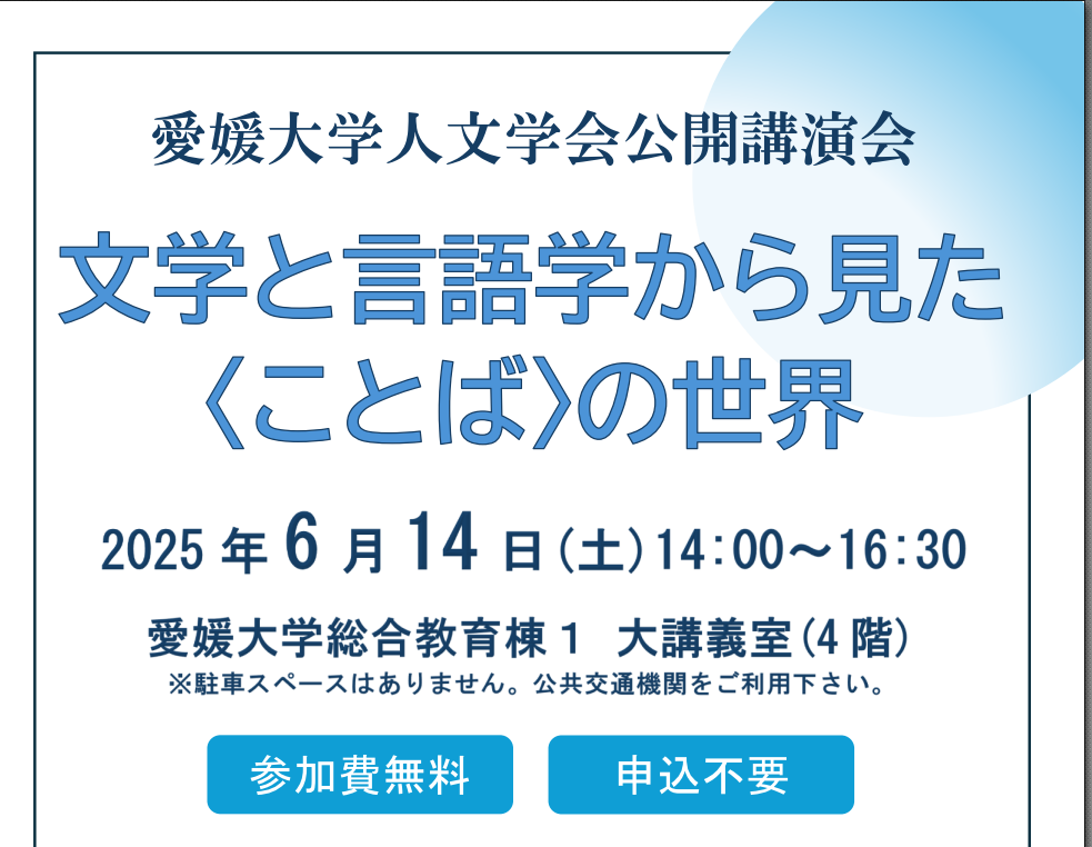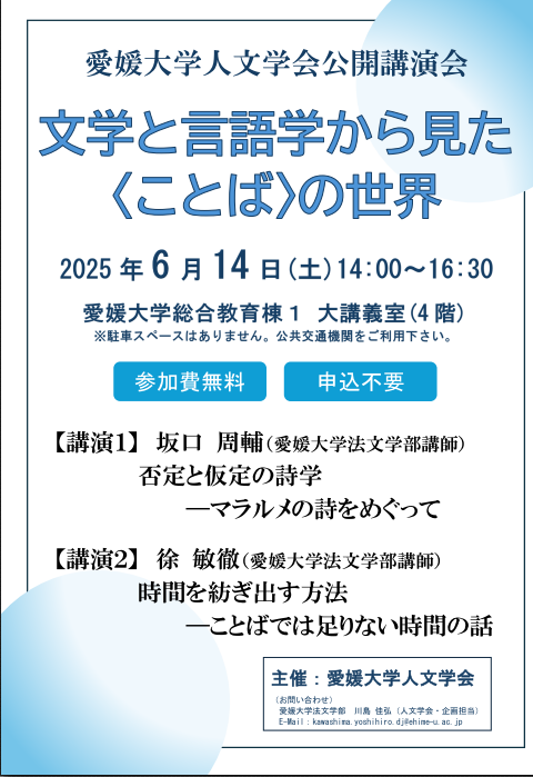 愛媛大学人文学会では、この度、〈ことば〉の世界をめぐって、お二人の先生方を講師に迎えご講演いただきます。坂口周輔先生には、フランスの詩人マラルメの詩のことばとその奥側に湛えられた世界について、徐敏徹先生には、ことばを超えた人間の表現のありかたについてお話いただきます。講演を通して、私たちと常にともにある〈ことば〉について、じっくりと考えてみませんか。